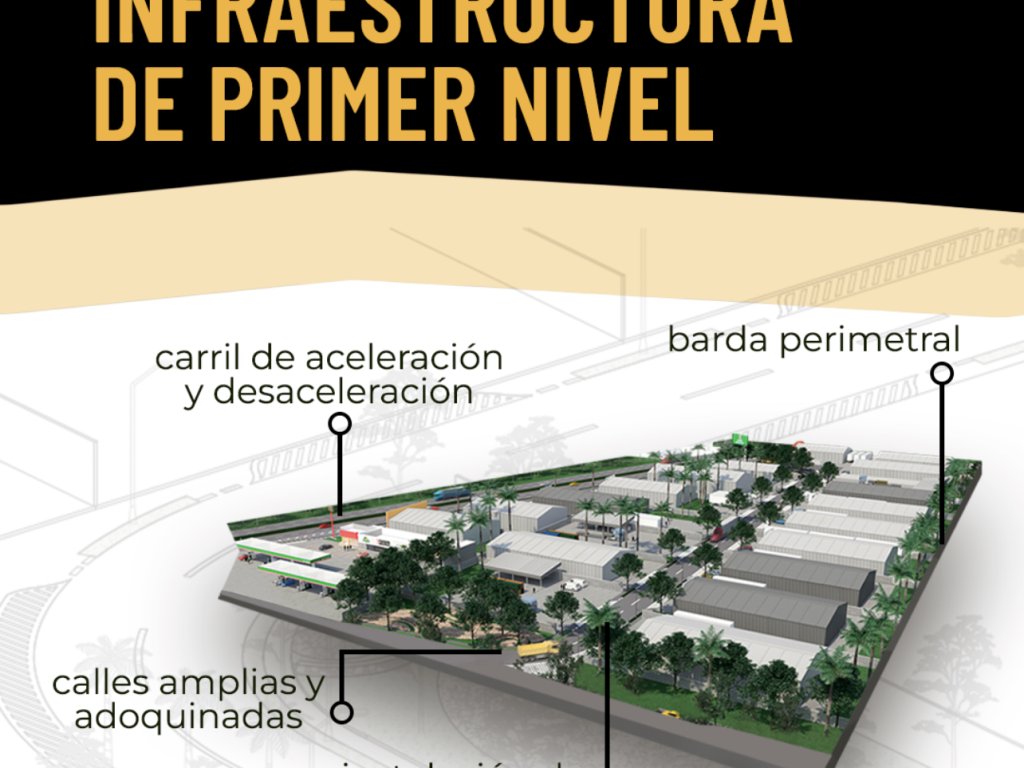 Único proyecto con acceso y frente de carretera logrando para nuestros clientes ser el lugar ideal para invertir y establecer tu bodega, taller, showroom con punto de venta, centros de distribución o almacenamiento, patios de maniobra.